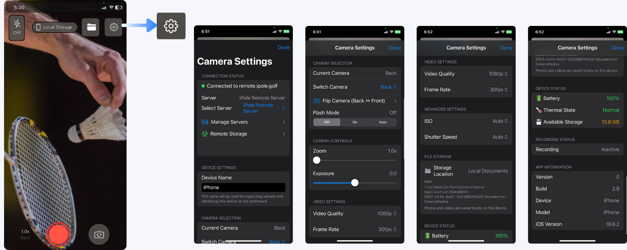 In Settings, you can easily connect to servers, switch cameras, adjust recording quality, and manage storage. All essential details like battery, space and recording status are clearly shown, giving you seamless control every time.