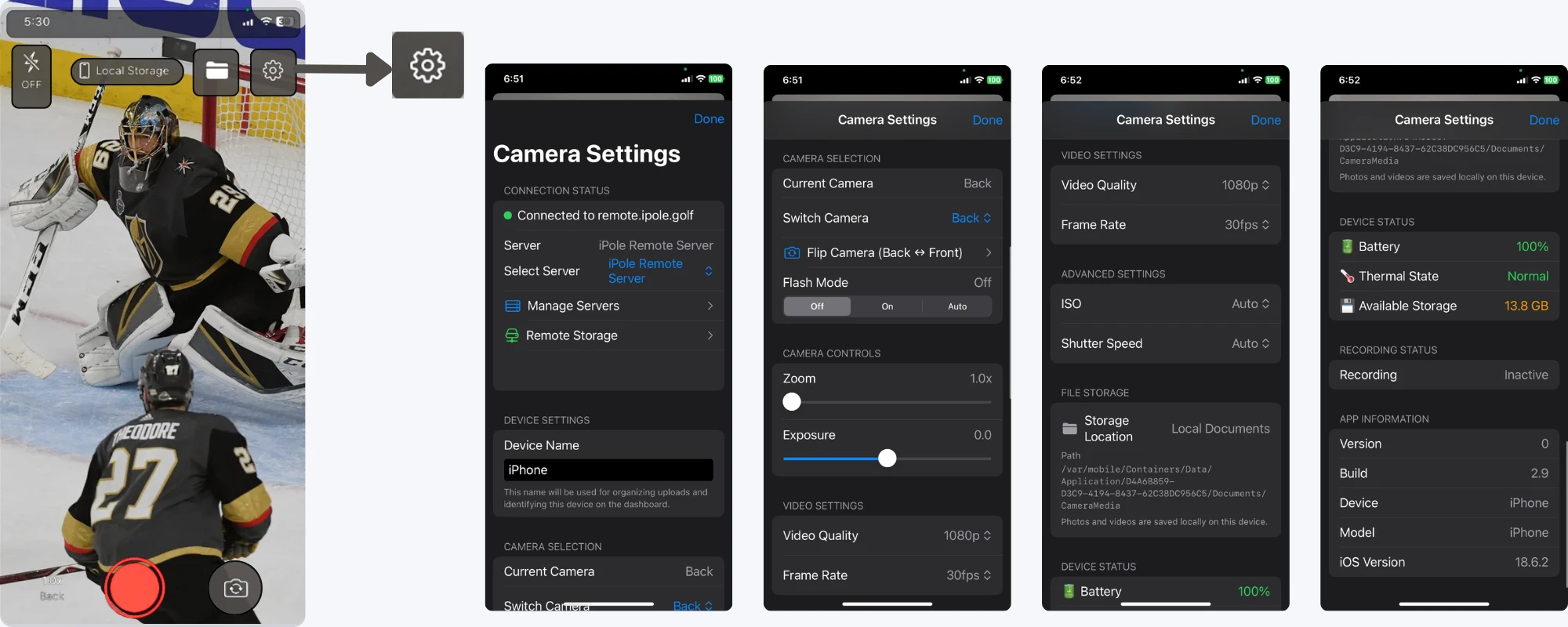 In Settings, you can easily connect to servers, switch cameras, adjust recording quality, and manage storage. All essential details like battery, space and recording status are clearly shown, giving you seamless control every time.