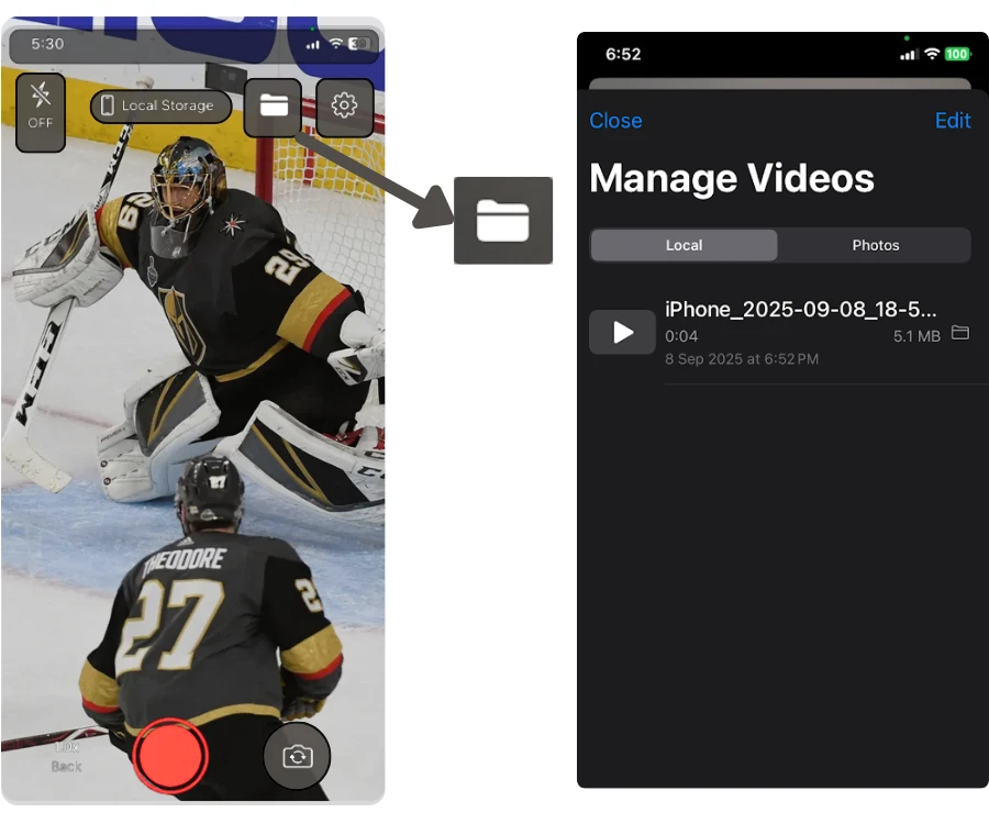 This is the app’s main camera screen, designed for speed and simplicity. Anyone can record, manage, and stay in control of their videos with ease.