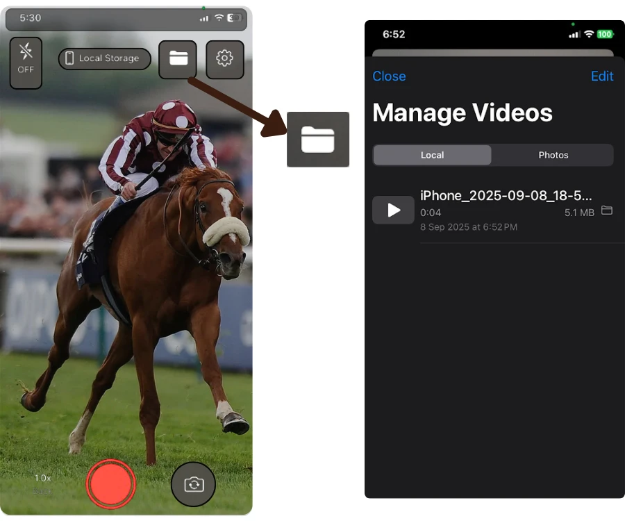 This is the app’s main camera screen, designed for speed and simplicity. Anyone can record, manage, and stay in control of their videos with ease.