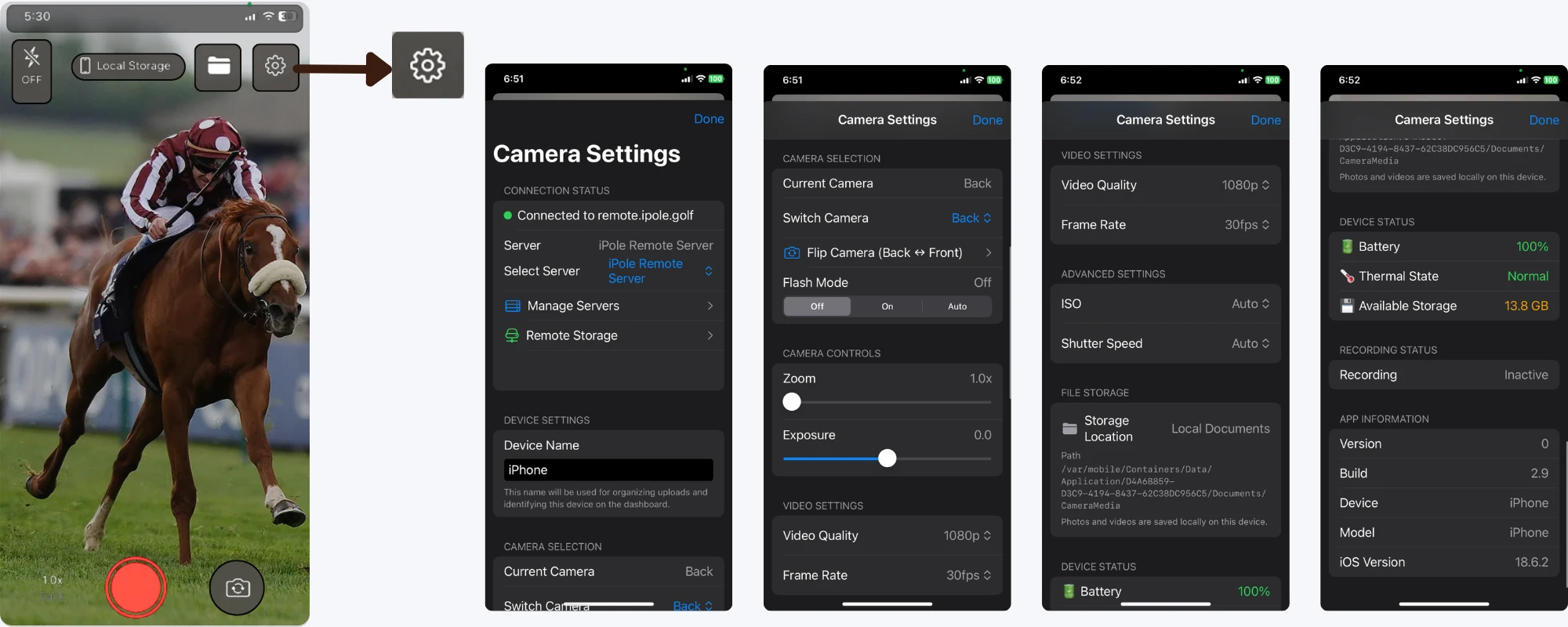 In Settings, you can easily connect to servers, switch cameras, adjust recording quality, and manage storage. All essential details like battery, space and recording status are clearly shown, giving you seamless control every time.