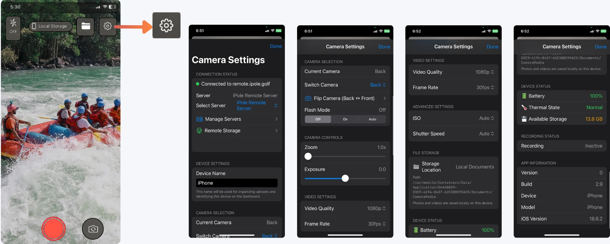 In Settings, you can easily connect to servers, switch cameras, adjust recording quality, and manage storage. All essential details like battery, space and recording status are clearly shown, giving you seamless control every time.