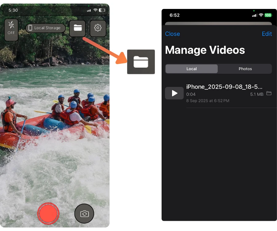 This is the app’s main camera screen, designed for speed and simplicity. Anyone can record, manage, and stay in control of their videos with ease.