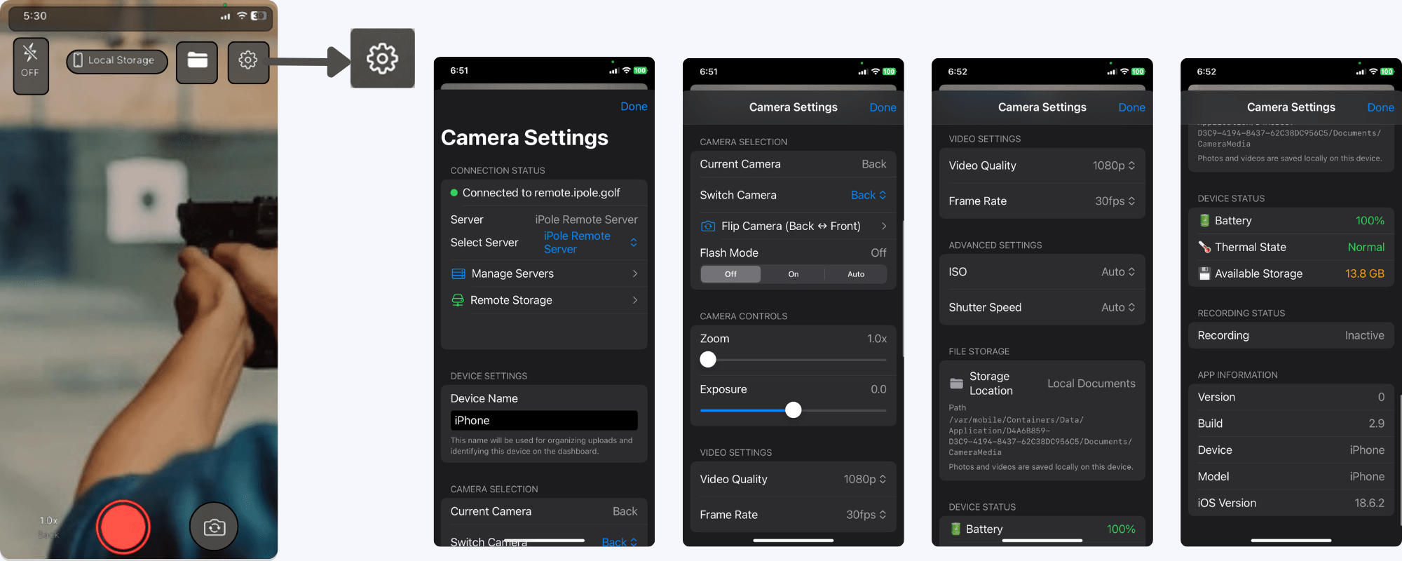 In Settings, you can easily connect to servers, switch cameras, adjust recording quality, and manage storage. All essential details like battery, space and recording status are clearly shown, giving you seamless control every time.