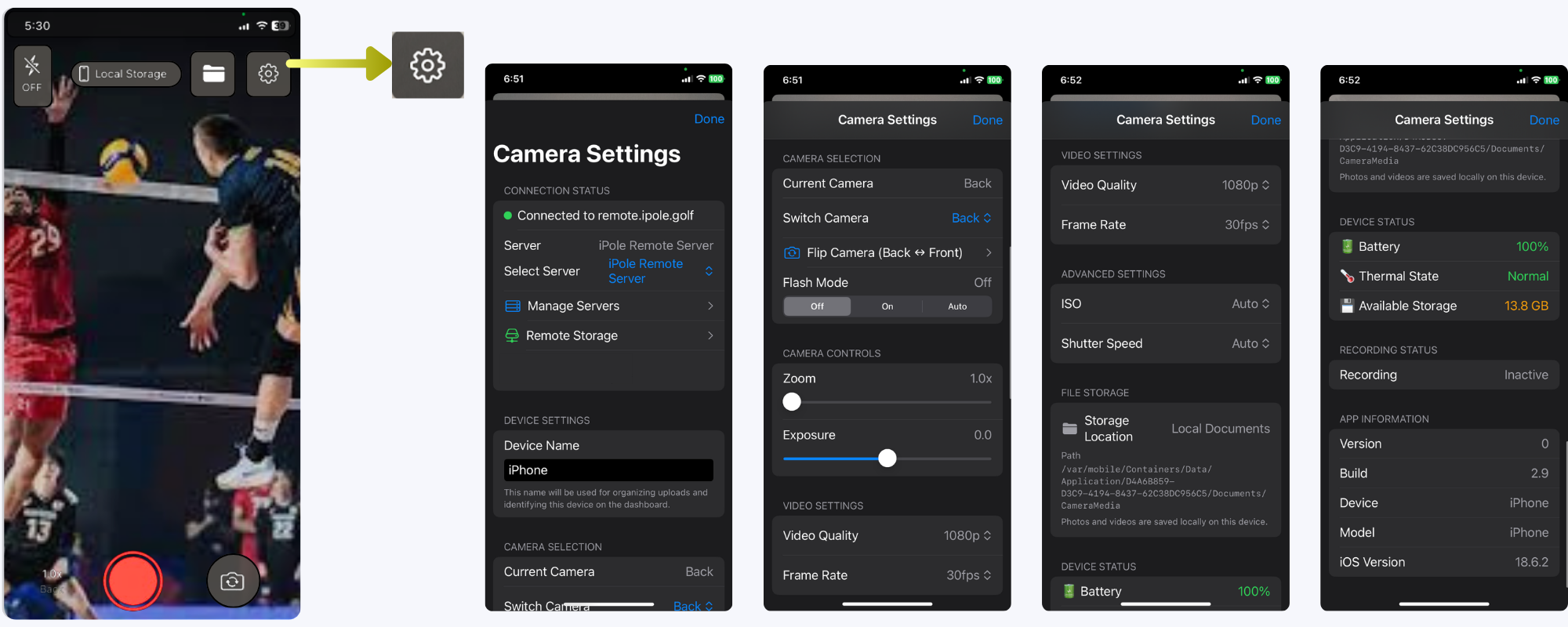 In Settings, you can easily connect to servers, switch cameras, adjust recording quality, and manage storage. All essential details like battery, space and recording status are clearly shown, giving you seamless control every time.