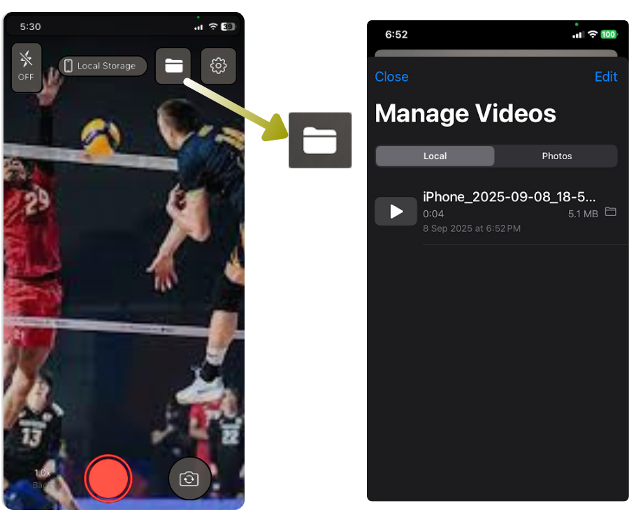 This is the app’s main camera screen, designed for speed and simplicity. Anyone can record, manage, and stay in control of their videos with ease.